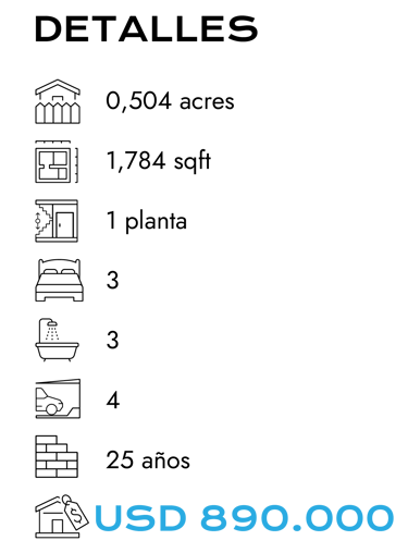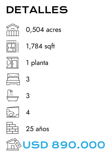 La casa tiene ventanas double hung, persianas de protección (algunas eléctricas), internet de alta velocidad y equipamiento completo: lavavajillas, microondas, refrigerador, cocina, horno autolimpiante y triturador de residuos. Además cuenta con garaje cerrado con portón automático, capacidad para 4 vehículos y espacio para RV. Entre sus mejoras recientes se destacan el techo nuevo (2020) y la puerta principal nueva (2023).